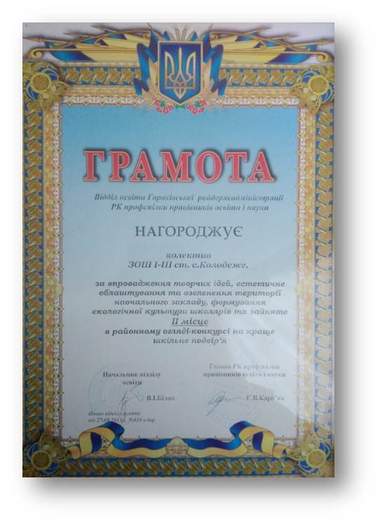 Колектив нашої школи два роки поспіль брав участь у районному огляді-конкурсі на краще шкільне подвір'я, готував презентацію «Парад квітів біля школи» та зайняв ІІ місце, нагороджений грошовою винагородою (1000 гривень) і грамотою за впровадження творчих ідей, естетичне облаштування та озеленення території навчального закладу, формування екологічної культури школярів та ІІІ місце, нагороджені грамотою та грошовою винагородою (500 гривень).